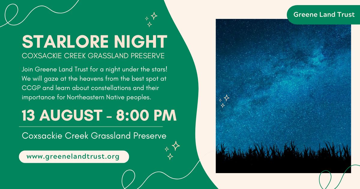 Join Greene Land Trust for a night under the stars at the Coxsackie Creek Grassland Preserve. Led by GLT stewardship manager Justin Wexler, we will gaze at the heavens from the best spot in the preserve and learn all about various constellations and their importance for Northeastern Native Peoples. As a bonus, we should get a good show of shooting stars from the Perseid meteor showers.